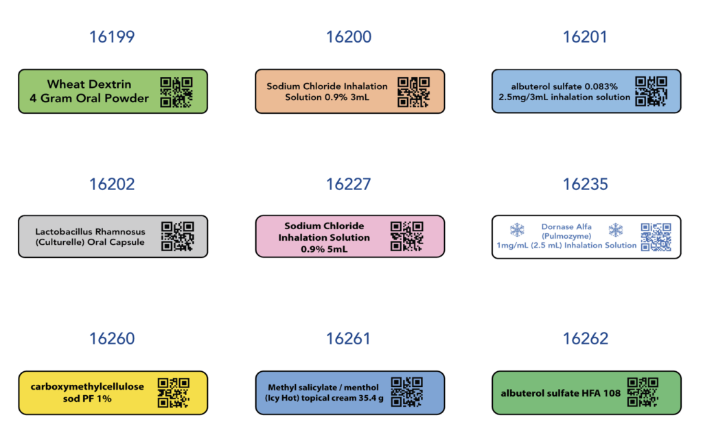 These labels are designed with clarity and safety in mind, featuring specific colors and clear descriptions for each medication. For instance, “albuterol sulfate 0.083%