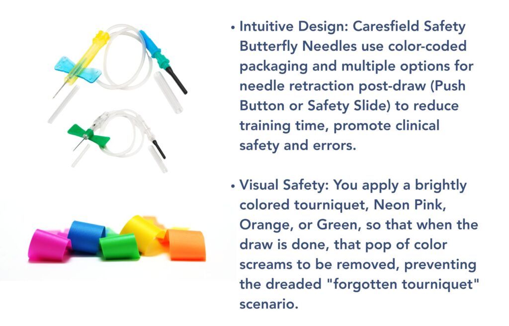 You walk into the room and need a specific needle size for your patient. There’s no need to read the fine print — you simply look for Green or Blue and see the correct size clearly marked on the butterfly needle packaging.