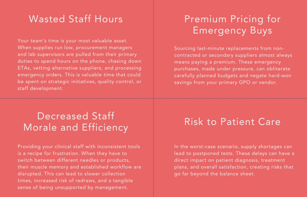 When a critical item like blood collection needles is on backorder, the direct cost of the product becomes a secondary concern. The real damage is done by the ripple effect it sends through your operations.