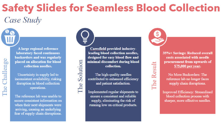The solution was two-fold. First, we implemented a schedule of regular, predictable shipments to ensure a consistent and reliable supply, eliminating the risk of running low on critical products. Second, we equipped them with Caresfield’s industry-leading blood collection needles – high-quality, safety-engineered needles designed for easy blood flow and minimal patient discomfort.